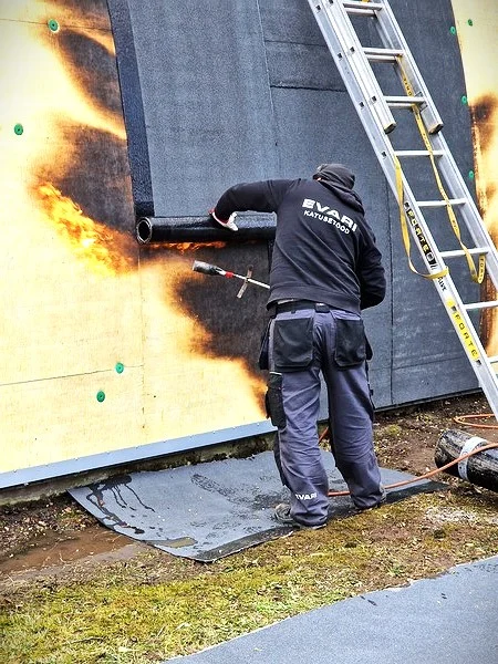 Kõige peale keevitame gaasipõletiga SBS-bituumenrullmaterjalist pealiskihi (kildkivipuistega), mis tagab pikaajalise veekindluse ja UV-kaitse.